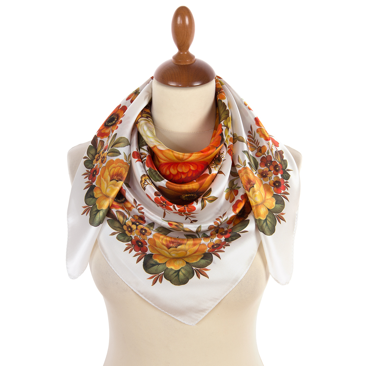 Платок шелковый (атлас) "Жостовский букет" 10063-0, 89x89 см
