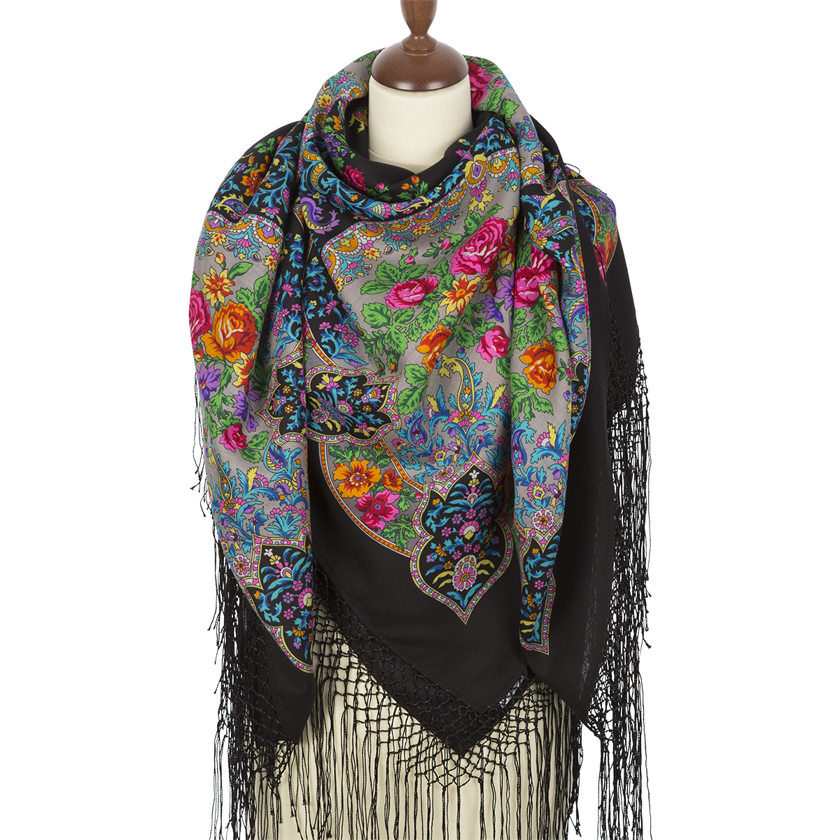 Шаль из уплотненной шерстяной ткани с шелковой бахромой "Медальоны" вид 18, 148х148см