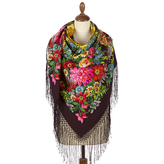 Шаль из уплотненной шерстяной ткани с шелковой бахромой "Рябинушка", 148х148см