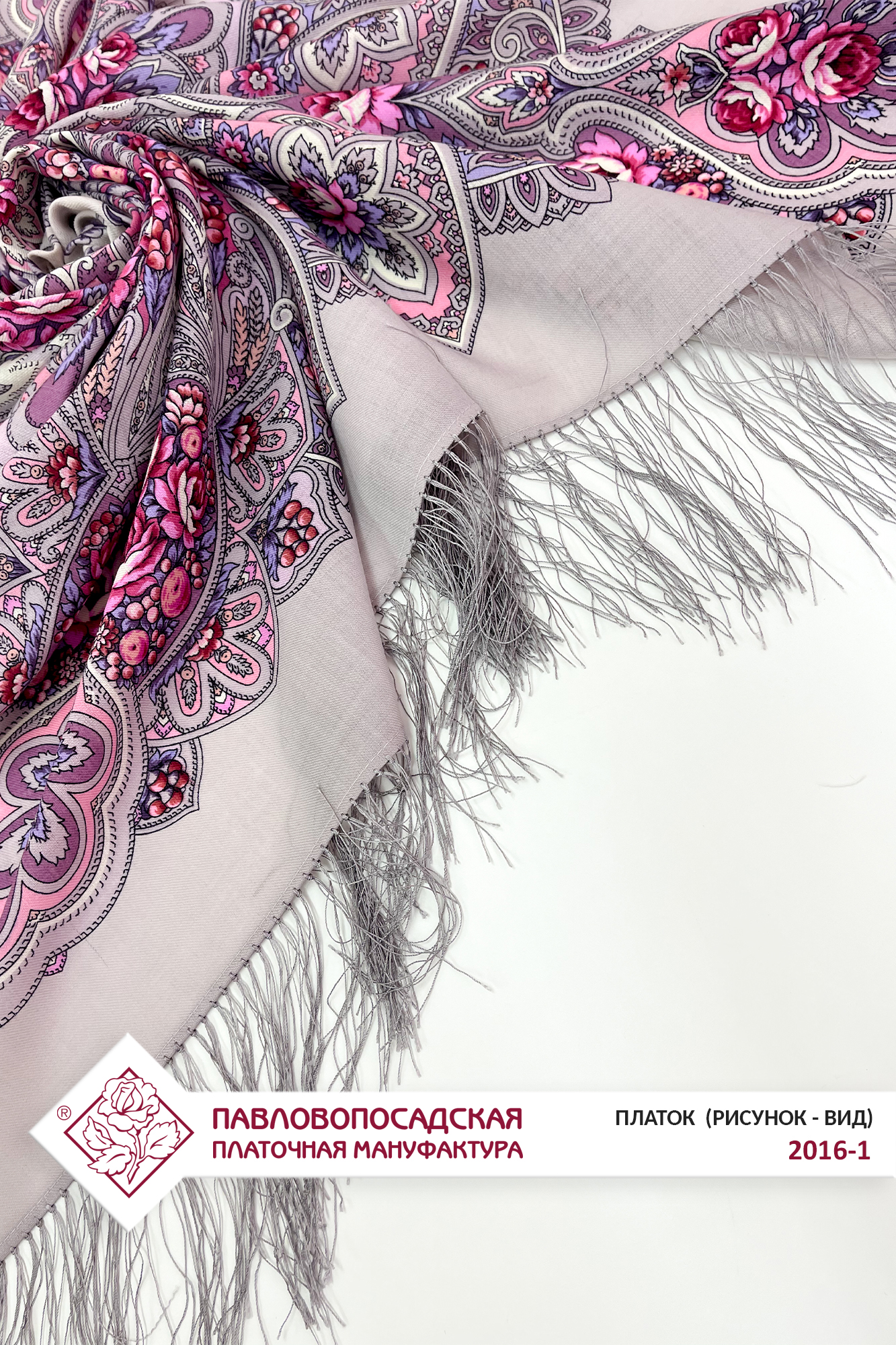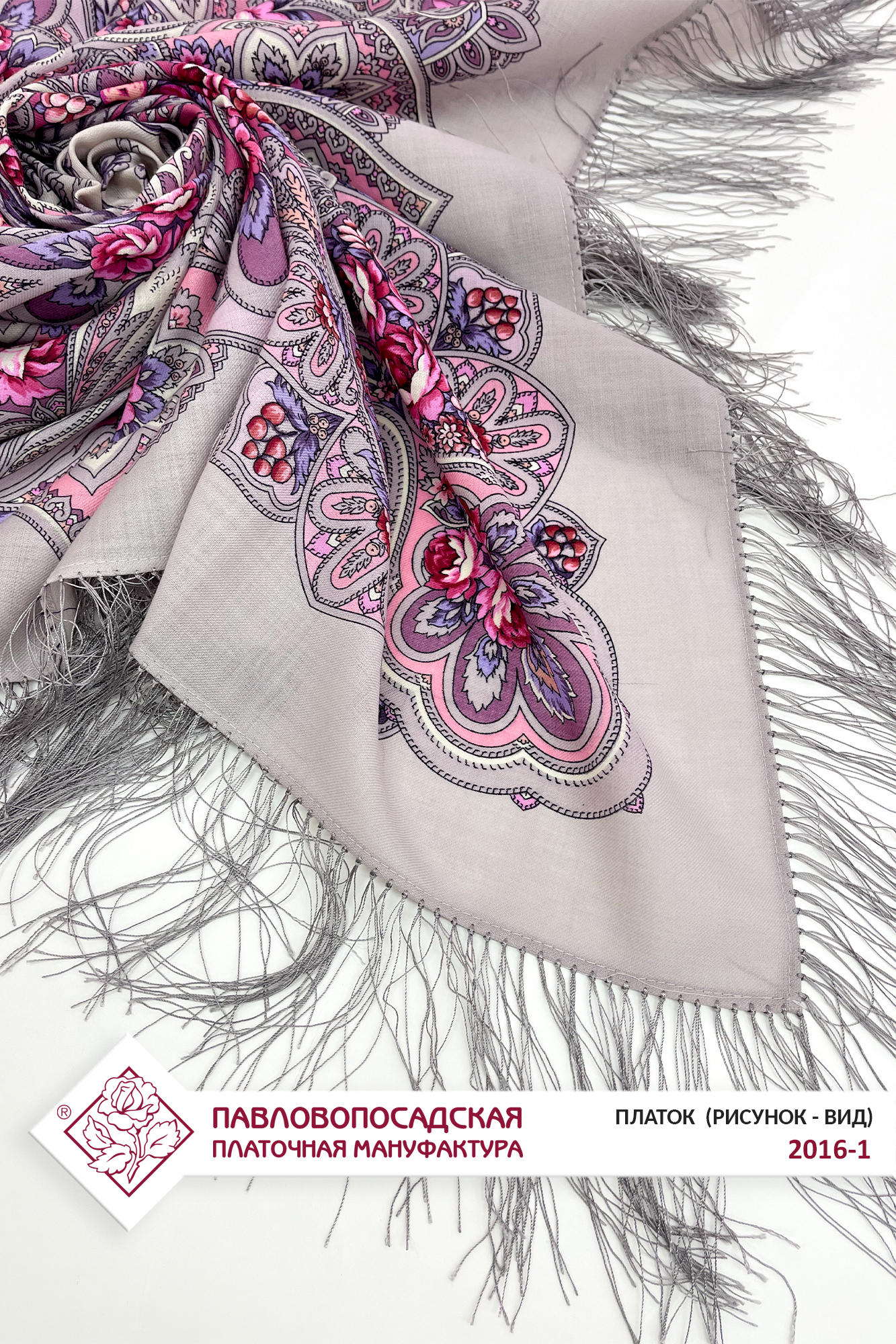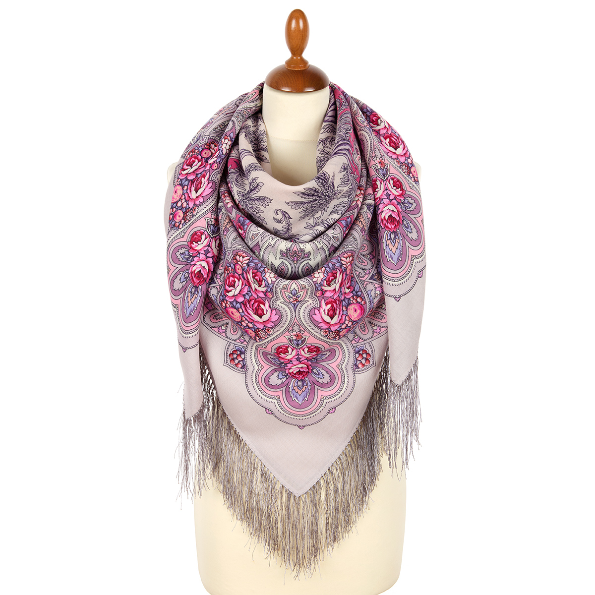 Платок шерстяной с шелковой бахромой "Зимняя роза", 2016-1, 125х125 см