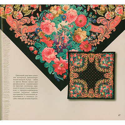 Книга "Павловопосадские шали", подарочное издание на русском языке Книга выпущена изданием ИНТЕРБУК-БИЗНЕС в серии ШЕДЕВРЫ НАРОДНОГО ИСКУССТВА РОССИИ. Содержит развернутую (20 страниц с иллюстрациями) статью об истории промысла и более 140 страниц с изображениями платков.